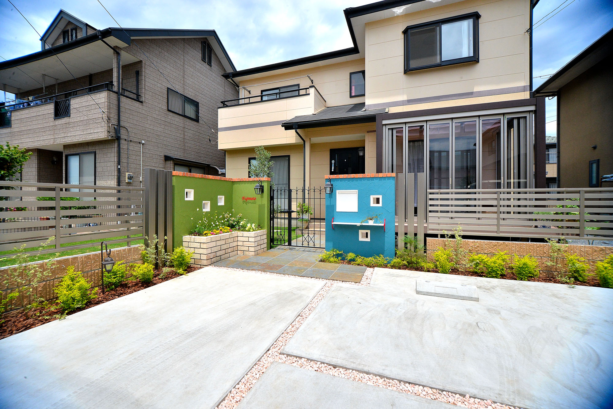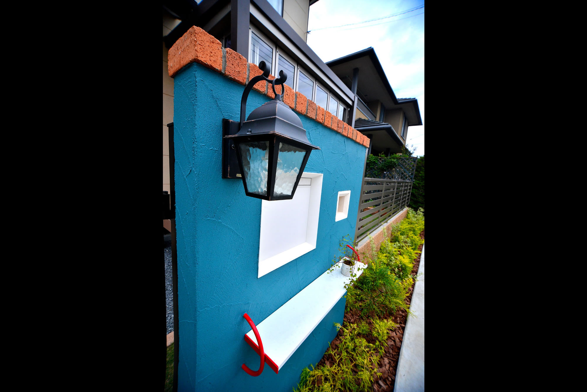リゾートを堪能する、生まれ変わった表情中古物件をご購入されたお施主様の希望が、「暗く古いイメージを大きく変えたい」「北欧テイストを取り入れたい」とのことで、斬新にも2枚の門柱それぞれの配色を変えました。