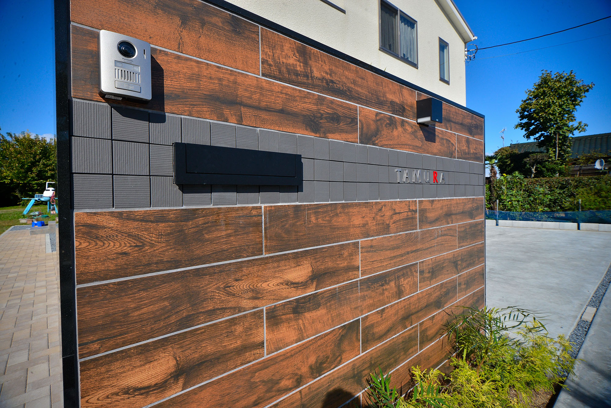袖壁は、しっかりとした木調のタイルがとても印象深く、手前にあるヤシと相性抜群です。 ヤシの下には天然石の乱形石が全体を引き締めています。
