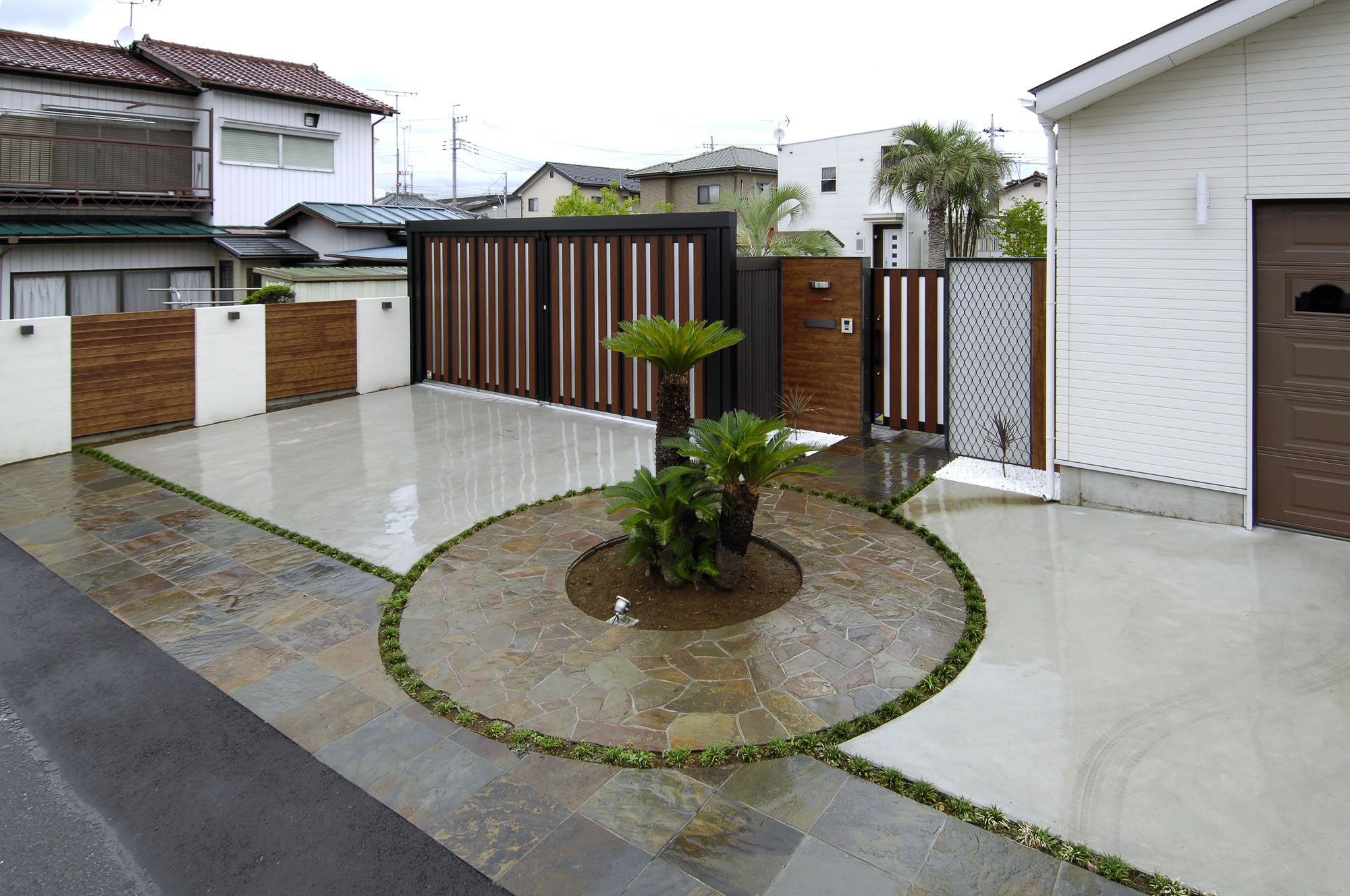 住宅街の中に息づく南国リゾート道路からの外観は高さのある門扉とカーゲートを使用し、プライベート空間を重視したクローズガーデンですが、全てにおいて木質調を採用することで閉塞感のない、やわらかなテイストにまとめあげました。