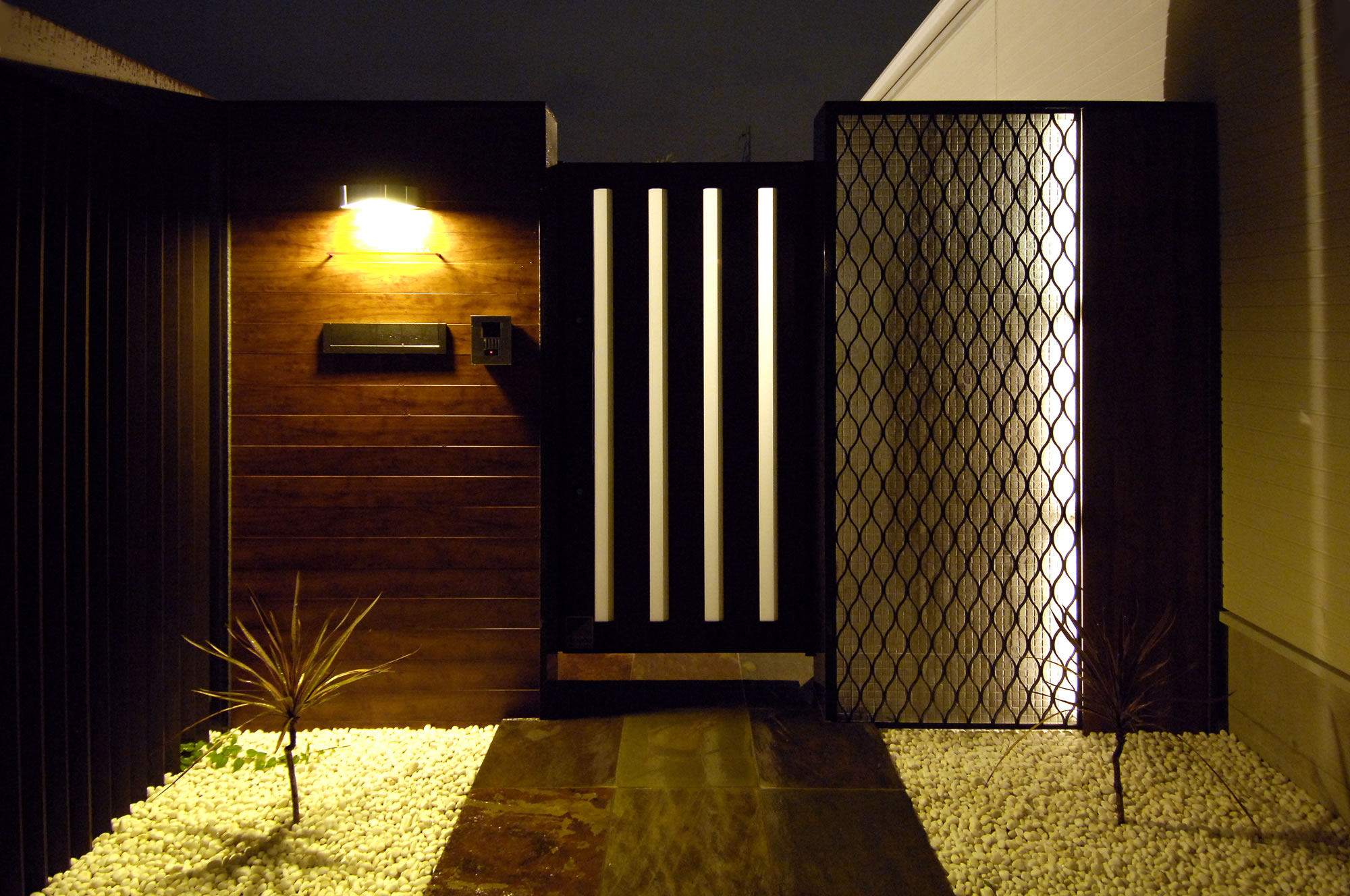 方形と乱形の石材を組み合わせたアプローチとココスヤシは、玄関までの長い距離をあきさせず、また夜間のアプローチライトは防犯性や足元の安全性に配慮しています。